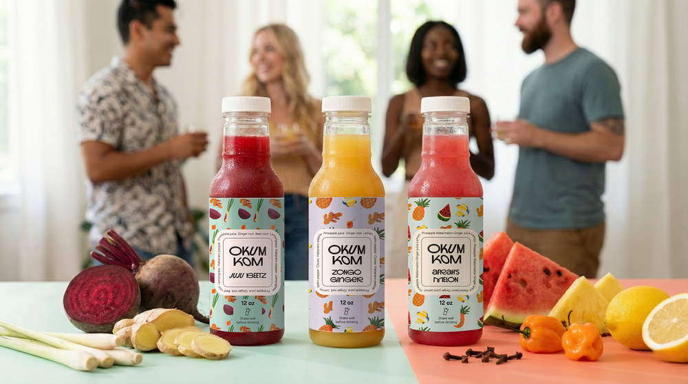 Founded by Sonia Amo-Akonnor and her spirited children, Akua and Kofi, Okumkom embodies the essence of family and tradition. Sonia’s childhood in Ghana was steeped in the wisdom of her grandmother, Maame Sophie, who taught her the art of crafting wholesome, delicious recipes from the freshest fruits and vegetables. At Okumkom, we invite you to experience the richness of our heritage and the purity of our ingredients.